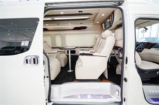 2022款丰田(进口)海狮-HIACE9座商务车采用2+2+2+3四排九座的设计,第二排和第三排均配备了两个Ottoman航空座椅,比埃尔法 (配置|询价)(配置|询价)要两张,第四排排放一张三人座的沙发床,即宽敞又实用,在空间运用上非常可以。2022款款丰田海狮的航空座椅有着超乎寻常的尊贵感和舒适感,侧壁更换意大利顶级真皮包袱手感极佳,侧壁菱形格的设计使整车层次分明立体感更强。侧窗豪华电动窗帘,面料阻燃隔热、隔光、隔音。顶棚更换意大利顶级麂皮绒零污染零伤害的环保材质,搭配桃木件及氛围灯的组合,营造出温馨舒适的乘车环境。