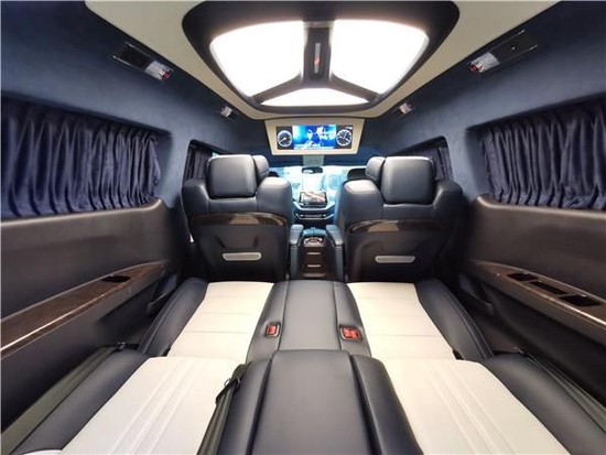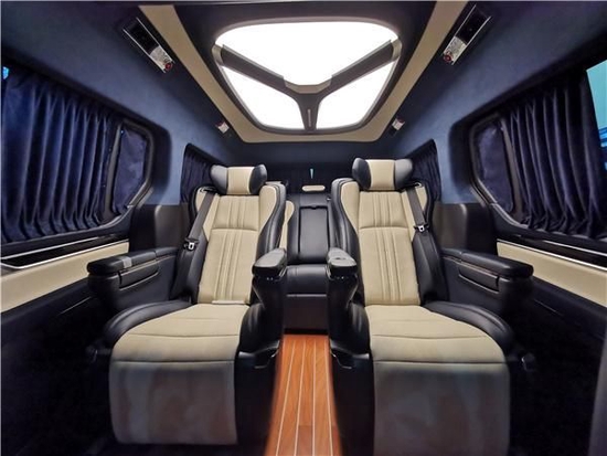 车内顶部为采用的是麂皮绒的软包加上星盾天幕顶灯,除了这些基本的功能性以外,整车在看不到的地方,比如四周全部做了隔音的处理,窗户上都加装的是高级私密窗帘,既可以避免阳光的直接照射,维护车内的一个用车环境,也可以很好的保护我们车主的隐私。