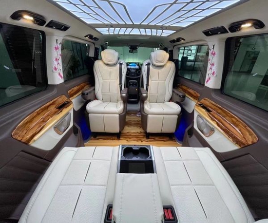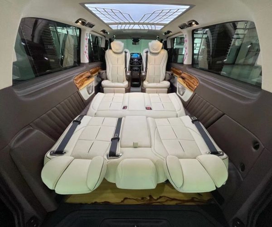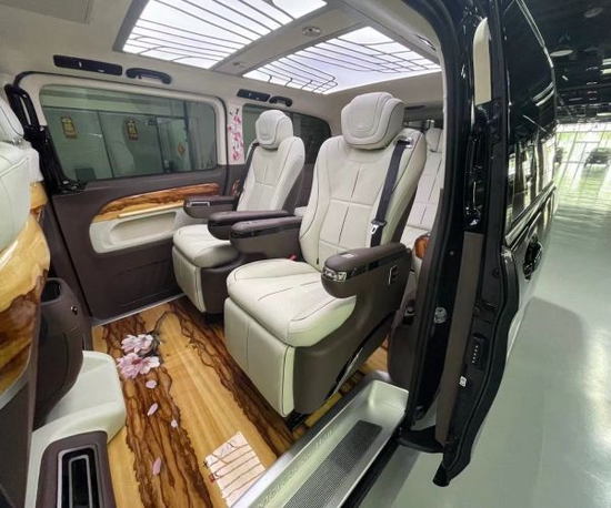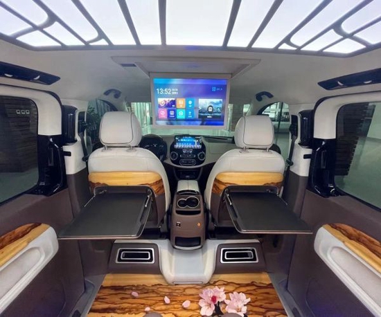 后舱的重新定制升级也是豪华感十足,采用了无隔断的7座布局,后舱星空顶+氛围灯营造出的明亮宽敞的感觉,全车也标配了电动的隐私窗帘。