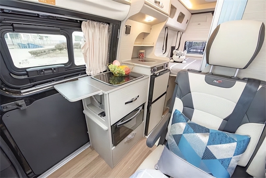 室内设计方面,作为瑞弗房车首款B级房车来说,室内色彩搭配非常不错,能给人一种耳目一新的感觉。驾驶室上方配备大尺寸钢化玻璃天窗,带有遮阳帘和防蚊帘。驾驶室副驾驶席可以享受旋转,紧接着生活区客厅部分采用双人单排座椅布置,带有可延伸的餐桌,可以形成一个3人简易会客区。