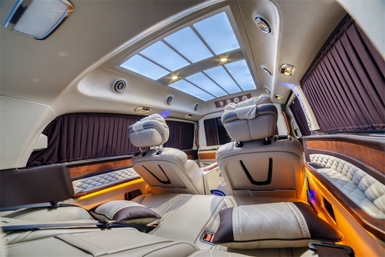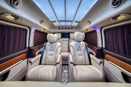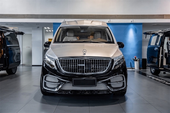 可以看到这款奔驰v260商务车,外观经过了全方位深度定制,大气镀铬进气格栅,楔形天使翼全LED大灯搭配上立标LOGO,将奔驰尊贵的气场瞬间释放。