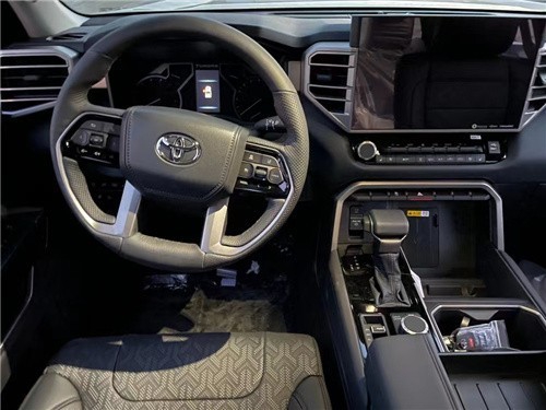 丰田坦途的内饰设计也采用了新设计风格,“硬”还是第一感受。无论是平直的线条还是灰白的用料配色,车内的风格都是非常偏向于越野,宽大的悬浮式液晶中控屏幕也是挺抢眼的,根据不同配置也将提供有8英寸以及14英寸的不同配置,就是这个感觉还是很像“大彩电”,只是放在这台车上会显得更协调一些,功能上也丰富了在线车联网以及CarPlay车机互联功能。