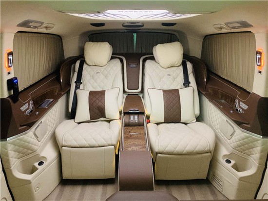 奔驰V260商务车系列改装隐藏六座商务车,第二排则为隐藏式座椅,可根据用车需求一键开合,收起时就会变成豪华吧台,科技感十足!两个奔驰GLS450 (配置|询价)的秘书座椅座椅,可电动语音识别进行收回展开,隔断处配备32寸高清液晶电视,立体环绕柏林之声音响,隐藏式咖啡机。