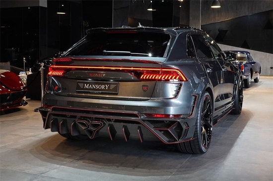 奥迪RSQ8 Mansory迈莎锐定制版,亮光灰搭配红色拉花。外观套件经过升级,Mansory为RSQ8新开发了和Mansory URUS同款的碳纤维后唇和中出排气系统。