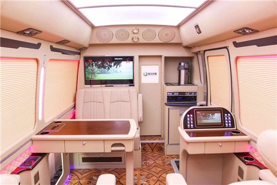 丰田考斯特改装设计了舒适的座椅,自然需要用高档的办公桌加以衬托,车内的文件柜,车载冰箱,置物盒的改装,华通丰业丰田考斯特改装商务车在内饰的设计上打造了自己专属的风格,而这些也恰恰是丰田考斯特改装商务车能够立足于商务车的市场主要原因。