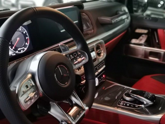 内饰是此次奔驰G级 (配置|询价)换代的最大最大亮点之一,给人耳目一新的感觉,双12.3英寸液晶通体屏幕外加与奔驰E (配置|询价) COUPE相同的空调出风口设计。沿用多年的四辐式方向盘也改为三辐式设计,三点以及九点处的多功能按键也与S级 (配置|询价)车型相同,两侧黑色触控按键可以控制仪表盘信息,其中行车电脑和右侧模拟仪表都可以进行切换,可显示油耗、续航里程、车辆状态等信息。