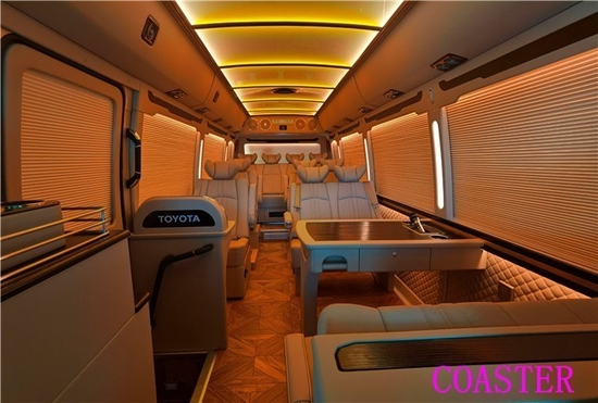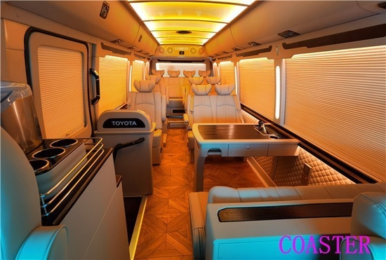 丰田考斯特18座19座改装商务车流线型的车头设计独特的坡度设计形神俱在,不失端庄的同时也带有俏皮之感,更以减少视野盲区为目的进行了配置的改进,让我们的行程更加安全。车轮毂罩,倒车影像,车身防爆膜,丰田考斯特改装18座19座商务车在外观的设计上充分体现了尊贵的色彩展现出与众不同的风格。在内饰的设计上,丰田考斯特改装18座19座商务车的与众不同之处就在于内饰的座椅设计以及色彩的搭配上。丰田考斯特改装18座19座商务车在座椅的选择上,我们可以根据自己的选择们可以根据自己的选择定制,真皮座椅,豪华航空座椅都可以根据自己的选择进行改装。同时还可以安装沙发床,方便我们在旅途中的休息。丰田考斯特18座19座改装不会惧怕和任何商务车的对比。