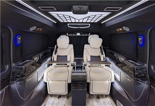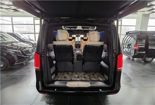 这款奔驰V260的贵宾舱采用的是两两对坐的商务洽谈格局设计,在大尺寸的液晶电视下方,奔驰V260配置了两个可折叠的秘书座椅,可一键电动展开。在两张秘书座椅的中间,是一个小型车内吧台,内置胶囊式咖啡机和一个折叠小桌台,最大限度的利用车内空间,折叠小桌台也可以给车内的商务人士提供一个处理文件以及与客户洽谈的平台。