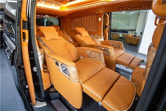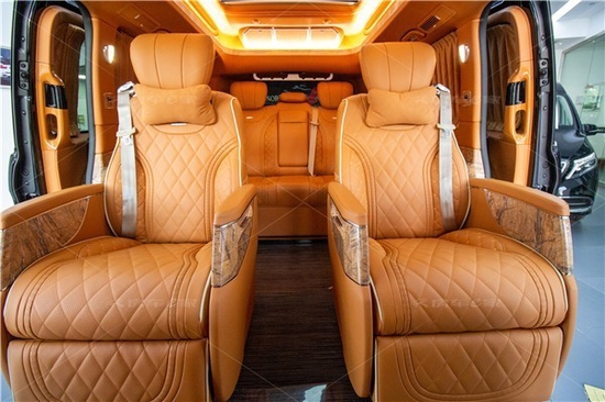 奔驰V260L改装商务车第二排头等舱座椅为带电动式、加温、推拿、自然通风功能的航空公司级长官席,可顺着上空上导轨进行一键气动式前后左右拖动,有关这类智能化系统的乘座感受,是原装车系愚钝的手动式拖动方法所自愧不如的。车里的车内氛围灯打开后,奔驰V260内舱越来越灵便变化多端,氛围还可以依据餐厅灯色调转换而转变,关键的乘座坐椅配备的单独的推拿功能,自然通风加温,一体腿托,功能丰富,乘座温暖,是外事接待出行的代步出行优品。