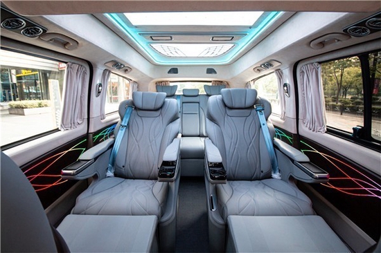 2022款进口奔驰V250商务车蓝色是一种低沉具有浑厚力量感的柔和暗色,它营造出整车内饰的寂静气氛,同时使用具有闪光感的金丝线穿插在暗色内饰中,使奔驰V250改装活跃了气氛,增添了些许生动,同时星空顶造型的加入,使得整个黑夜韵味涌现明朗与安详。