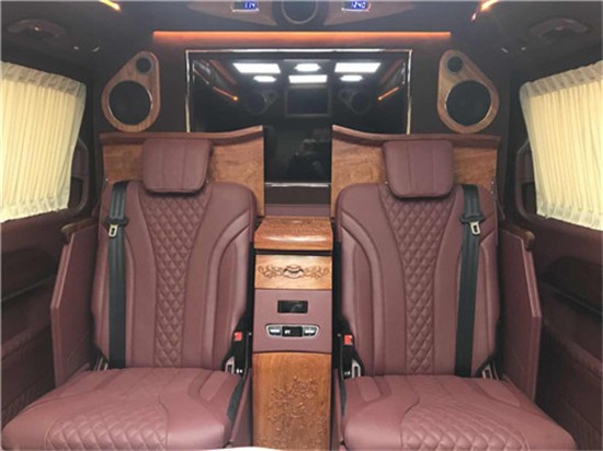 奔驰V260改装红木总裁版贵宾舱装饰极其奢华,宛如皇家宫殿,舱内采用大量缅甸黄花梨装饰,并纯手工打造精美雕花,古色古香,奔驰V260商务车又仿若一方富甲书房。奔驰V260红木总裁盛世祥云版设计理念为高端人士商务用车之选,内饰科技感十足,座椅采用4+2隐藏六座设计,在车身长度5370mm的基础上更充分利用车内空间,在32寸电视周围用黄花梨木进行装饰,第二排座椅采用的是GL450反向座椅,可语音控制电动调节。指纹式保险柜,隐藏式ipad电脑,车内饰烟灰缸,全部都用红木和鳄鱼皮进行打造,细节,工艺,无不体现此车内部的豪华程度,更有车载WIFE,电子狗等系统。