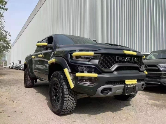 外观方面,新车传承了道奇Ram家族高大威猛的造型设计,同时细节部分融入了更多高性能元素,包括经过黑化处理的前格栅,引擎盖两侧的黑色进气口,以及为了容纳巨大的机械增压器而设计的通风口等等。此外,新车还配备了视觉冲击力更强的黑色轮眉和外露式的拖车钩,看上去十分霸气。