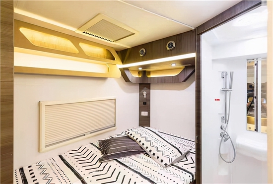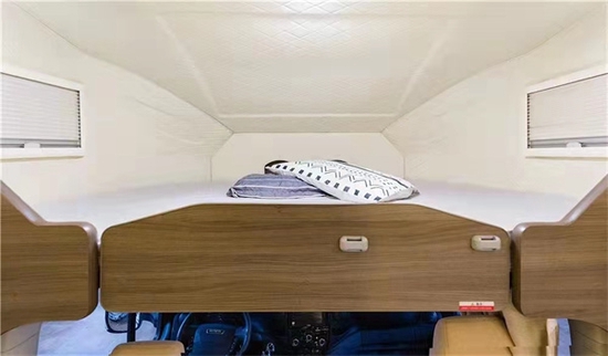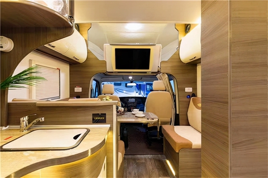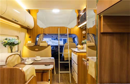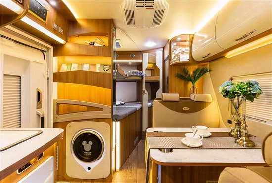 进入车内被这款房车金碧辉煌内饰的气势所震撼,在灯光的映射下,白色烤漆柜门以及晶莹剔透的玻璃门都在闪闪发亮,无处不彰显奢华。车内家具选用环保板材,地面铺设的是环保阻燃地板革。拓展舱打开后,内部空间极其宽敞,可以供一家人舒适生活,内顶安装了美国进口MAX十速双向的换气扇。