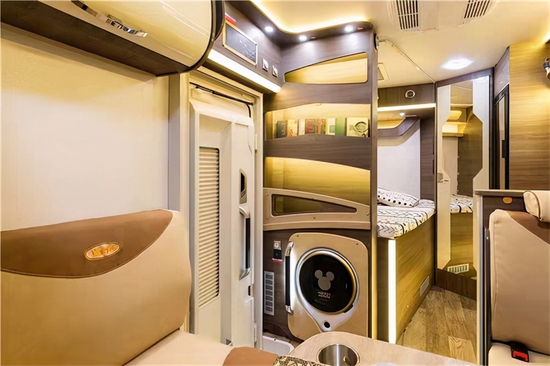 对坐卡座的沙发布艺为整体灰色搭配简约线条,餐桌为整体深色,对卡座靠窗集成了usb插口与电源接口,更方便乘坐时使用。对卡座沙发也可拼接成床形成为一个临时休息区,拼床后尺寸为:1900*1000mm。厨房区位于车门右手边,配备了微波炉、电磁炉、洗菜池与油烟机,下方集成了大宇2.5kg洗衣机,车载冰箱放置在对卡座后方,配备了152L进口塞特福德车载专用冰箱。