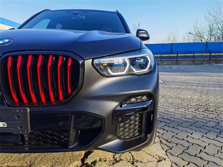 21款宝马X5外观相当霸气,外观设计硬朗犀利,整车尺寸比之前的车型略大,更大的进气口和延伸至前中央进气格栅的冰铜车底护板,虽然尺寸更大宝马一贯对称的风骨不失宝马X5的独特之处在其动感的线条轮廓中一目了然。一些最新的家族设计也被用于一些设计元素的创新。前格栅变化明显,更显修长,并与大灯融为一体。