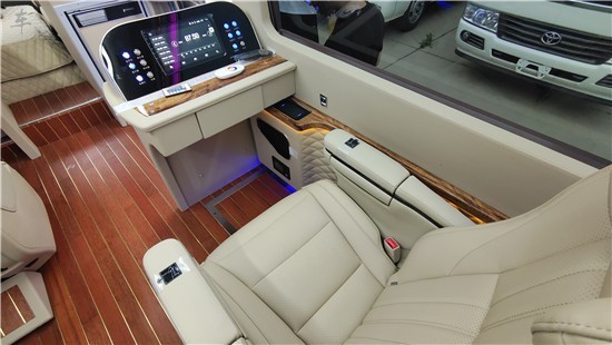 丰田考斯特11座在原车的基础上进行了外在的装饰和内饰设计的改装。首先就是在车内座椅的设计上,丰田考斯特11座改装商务车在座椅的设计上有很多种不同的方案设计,因为原车的座椅太简单,所以我们可以给座椅包真皮,真皮有米色和棕色两种不同的选择,我们可以根据自己的喜好完成我们的私人定制。同样360度可旋转首长席搭配舒适高大的办公桌,可以将丰田考斯特打造成最舒适的移动办公室。
