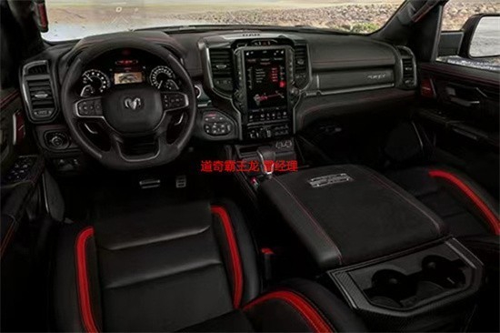 新车在内饰部分进一步强化了其高性能版本的形象,中控台和座椅随处可见的TRX标识便是最好的例证。同时,作为道奇Ram家族的旗舰车型,新车还配备了12英寸竖置中控屏幕,除了支持蓝牙、导航和车载Wi-Fi等常见功能,还支持Apple CarPlay和Android Auto手机映射。