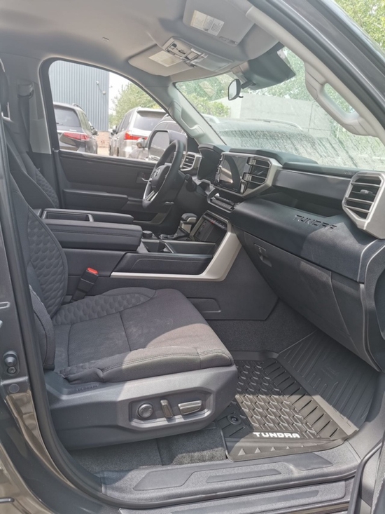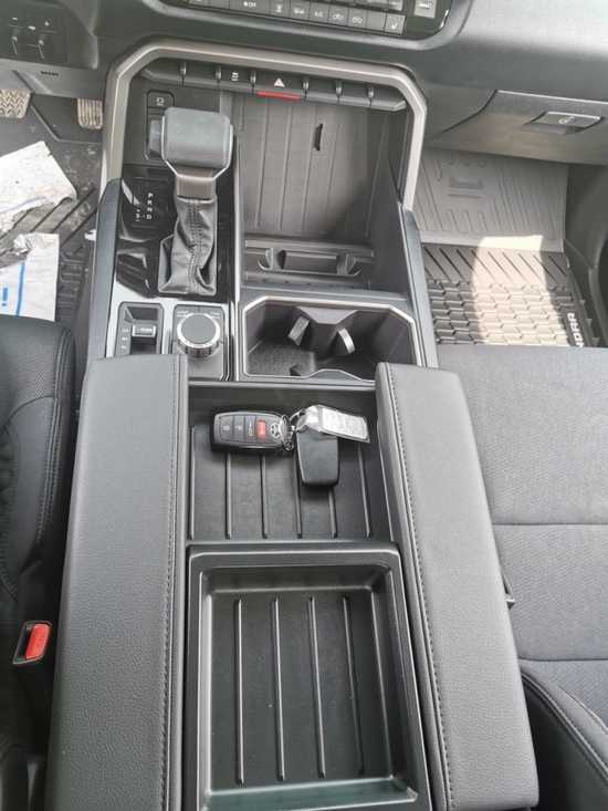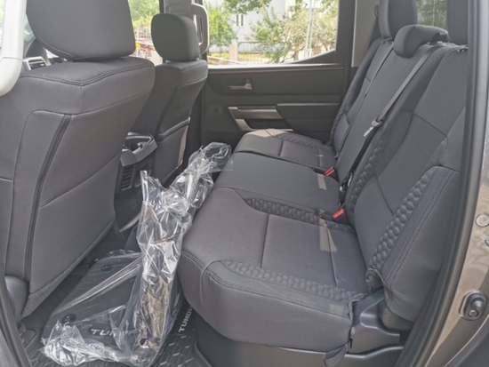 2022款新款丰田坦途3.5TT座椅提供有皮质包裹,整体的造型也非常宽大,在中央扶手区域的设计上也采用了非常方正的造型设计,并且可以看到前排的储物空间设计还是非常丰富的。