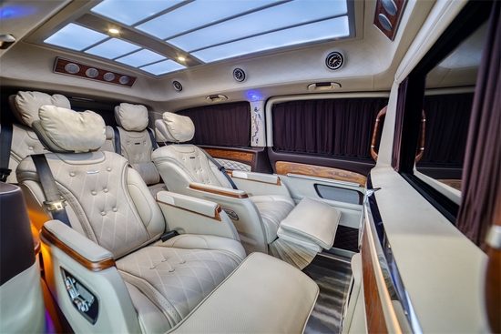 可以看到这款奔驰v260商务车,外观经过了全方位深度定制,大气镀铬进气格栅,楔形天使翼全LED大灯搭配上立标LOGO,将奔驰尊贵的气场瞬间释放。