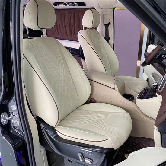 奔驰威霆改装版第二排座椅采用两个62S首长级座椅,带加热,按摩,通风,一键式电动调节记忆等功能。 奔驰威霆版座椅符合人体工程学设计,同时带有电动椅背调节,电动头枕,电动前后调节,180°旋转,一键式伸缩腿托功能,带来头等舱级舒适体验,私家客厅级后舱体验,180°旋转后可以与第三排电动沙发床进行无缝拼接,满足两个成年人一个小孩的正常休息,带来卧室级舒适享受。