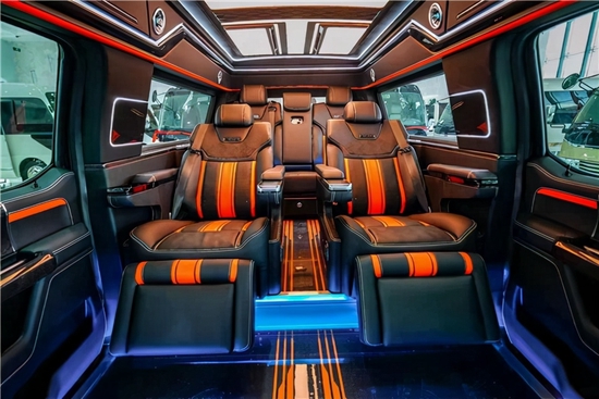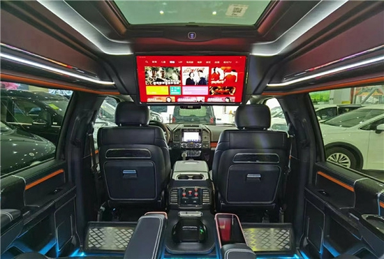 第二排是两个独立座椅,舒适度跟商务车比也毫不逊色,当然也可以选装带通风加热按摩的航空座椅等。 由于是皮卡车升级改装而来,地盘是非承载式车身的关系后排会比前一二排略高,但得益于福特勇猛庞大的车身尺寸以及后车窗和全景天窗,头部空间以及腿部空间都并不显得局促,反而让乘坐于第三排的乘客会有种居高临下的感觉,有着很好的视野。