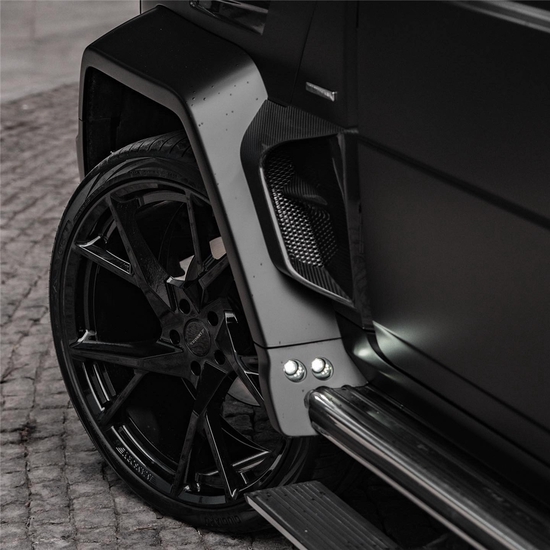奔驰G63 Mansory迈莎锐定制版,全车升级了P720宽体包围套件,可视碳纤维均采用T200经典碳纤维纹理并搭配哑光黑油漆。
