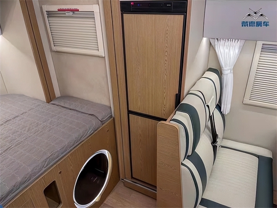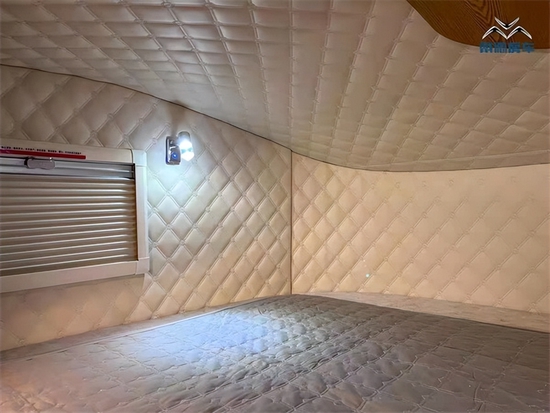 全新E途Pro max内饰布局基本没变,以额头床+中置4人会客区+中置厨房+车尾拓展床位+卫生间为基础格局,只是在个别家具饰面上进行了微调,比如厨房区和卫生间门板位置大量使用了白色和浅灰色的饰面装饰,相比以往的原木饰面来说,局部的变化让车内的整体明快感有了比较大的提升。额头区域是双层PVC结构,内部整个包覆的是菱形软包。这张额头床的最大尺寸为2180×1500(mm),额头床入口最大高度650mm,床位尺寸足够大,入口高度表现一般。戴德E途系列车型显著特征:将电池组置于车内中门的右手边,可避免冬季户外严寒导致的电量衰减。新款E途仍然采用的是全车48V电路系统,搭配48V 420Ah锂电池(21.5度电)和48V 3500W逆变器以及1500W的充电功率。另外还标配了1350W光伏板(10块)。