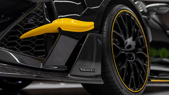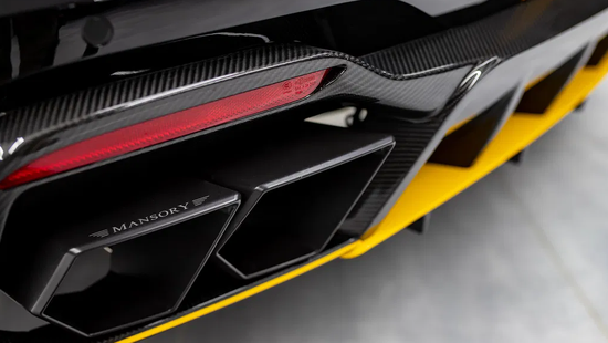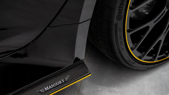 跟随着黄色的线条,侧裙部分和轮毂周边在黑色车身下显得格外醒目,让高性能轮胎没法再像往日那般低调。细节之处我们看见了MANSORY迈莎锐的字母标识,好像在做某种宣誓。车尾部分,外包围处夸张的处理手法让人一眼吸睛,巨齿般的造型好似鲨鱼的牙齿,锋利无比。