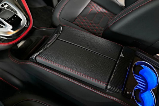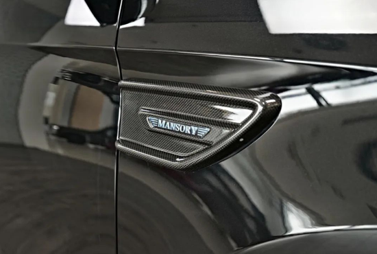 黑色与灰色两种颜色拼接设计的车身,低调高级且有质感,前脸格栅采用双层帕特农神庙造型,中网内部使用熏黑手法,视觉上打造出丰富的层次感,带来强烈的震撼,车头部分,大面积碳纤维元素有出现,作为用碳专家,MANSORY迈莎锐的绝活再次得到展现。