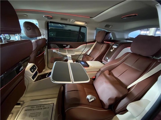 迈巴赫GLS600第二排独立座椅相比普通版GLS更加靠后,并且带有巨大的腿拖,其后排座椅最大倾斜角度大43.5度,后排腿部空间最大达1.34米。中央由冰箱、控制台、储物空间和手机无线充电台等进行贯穿,呈现出类似于迈巴赫S级 (配置|询价)一样的头等舱设计。