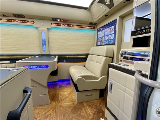 丰田考斯特改装商务车不仅仅可以改装成商务用车,同样也可以打造出我们专属的移动房车。,丰田考斯特当然考虑到大家在日常生活中的基本需要。人的一生所追求的也就衣食住行而已,丰田考斯特改装商务车在这一点上可以满足大家所有的需求。丰田考斯特内饰中还可以有餐具厨房,简单大方的设计,高贵优雅的空间,在那样一个7米长的车内,却显示出了与众不同的的风味。洗手间或者置物柜,丰田考斯特改装商务车在内饰的设计上,为我们营造了加的温馨。
