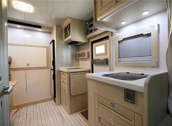 由乘客门隔开,不同的功能相互呼应的同时也让做饭井然有序,橱柜推拉式抽屉便于存放日常生活用品及碗具。其它方面配备触摸式集中控制系统+机械式翘板开关、液晶电视、小米盒子、日本YAMAHA八喇叭音响系统(带低音炮)、抽油烟机、微波炉、西门子电磁炉、152L赛特福德房车专用冰箱、大宇3kg洗衣机、特鲁马燃油暖风热水一体机、四路监控、一氧化碳/烟雾报警器等。室内多个220V、12V电源插座及USB充电接口可满足日常充电需求。
