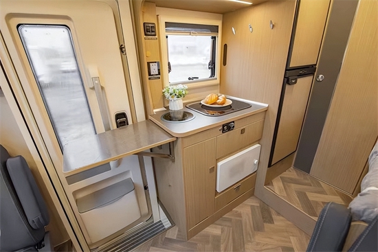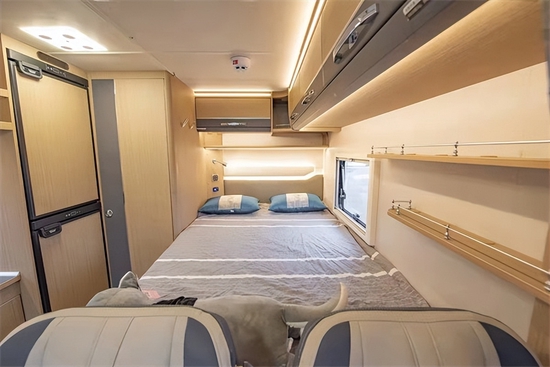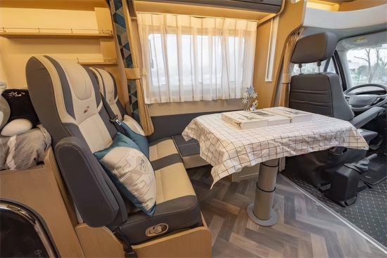 进入车厢,不得不说这款房车内饰设计和配色着实让人眼前一亮,既温馨又有质感。虽然这款房车没有拓展机构,但内部整体空间表现中规中矩,不算宽敞,但绝对够用。因为是小额头房车,所以并没有额头床,取而代之的是大尺寸天窗和储物格,此外还有一台29寸液晶电视。会客区采用了L形沙发+单人座椅+升降餐桌的布局,座椅采用了符合人体工程学的沙发座椅,支撑性更好,保证了长途旅行乘坐的舒适性。