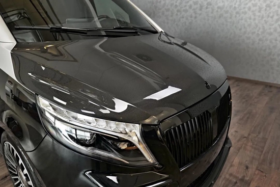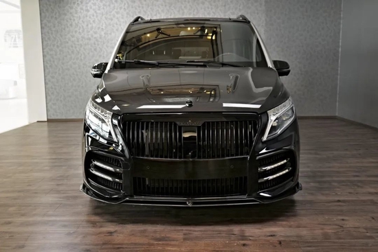 这款纯进口MANSORY迈莎锐MV600·赫迪格栅部位依然延续了国内定制MV600的上下双层“帕特农神庙”形态,区别是中网采用了熏黑处理,比老款亮银镀铬更显高雅神秘;此外诸如:引擎盖带进气口、前唇、前保分离器、格栅框、大灯罩等部位都采用轻量、坚固、抗拉伸、耐高温的材料界“黑色黄金”—T200盾级碳纤维做了无损嵌合处理;宽体前包围带来的视觉效果霸气凛然,很符合商务车“有容乃大”的调性。