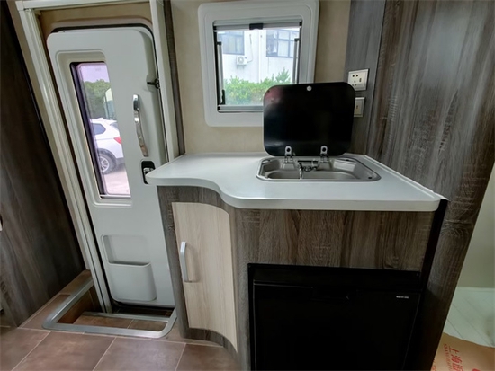 车内的厨房区域规划的很紧凑,避免浪费空间,但该有的配置一点没少,带盖的洗菜池、隐藏式可折叠搁板、两个带锁储物抽屉、110L大容量车载冰箱,轻松制造一顿美食完全不在话下。电路方面车辆配备了:锂电池150AH、逆变器3000W、液晶屏房车集成总控制系统、多个220V电源插座和室内12V电源插座等。
