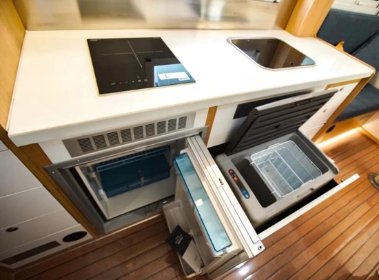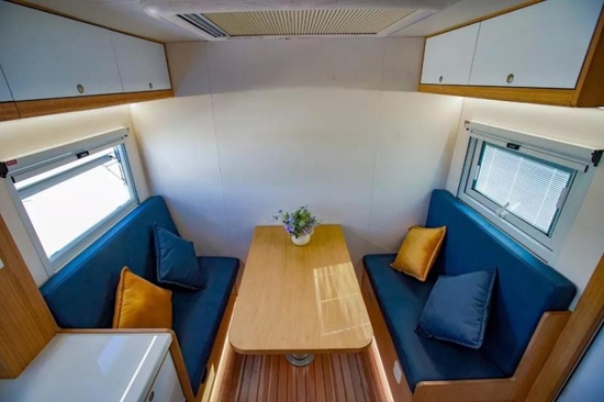 二手德国MAN进入到房车生活区,生活区和驾驶区是隔断的,想要联系需要通过车内的对讲机。房车的前方是会客区,会客区采用对向卡座沙发座椅搭配升降餐桌。会客区边上就是厨房区域,厨台上配有电磁炉和洗菜池,下方就是一台冰箱。紧挨着厨房的就是一个大衣柜。在厨房和衣柜对面就是卫生间。卫生间内配有生活所需的配套设施。这款房车配有330L净水箱、25L热水箱双水路系统。
