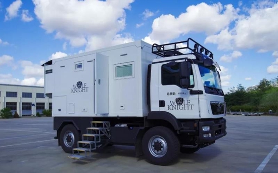 该车基于德国MAN TGM 4X4 13.290底盘改装,四轮驱动,最高功率290马力,搭载的是一款6.87升柴油发动机,匹配12速越野模式变速箱,峰值扭矩达到了1150Nm,驾驶室超高舒适性,整车带有前桥、后桥、桥间三把锁,使其拥有强悍的越野能力。在车身防护方面,底盘车身箱体防护 ,全表面喷涂刚性高科技纳米防腐材料。该车最大核载人数为3人,生活区最多可休息4人,满足欧六(国五)排放标准。
