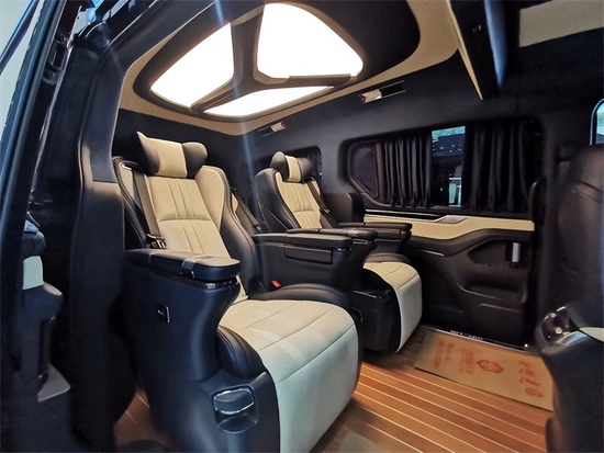 车内顶部为采用的是麂皮绒的软包加上星盾天幕顶灯,除了这些基本的功能性以外,整车在看不到的地方,比如四周全部做了隔音的处理,窗户上都加装的是高级私密窗帘,既可以避免阳光的直接照射,维护车内的一个用车环境,也可以很好的保护我们车主的隐私。