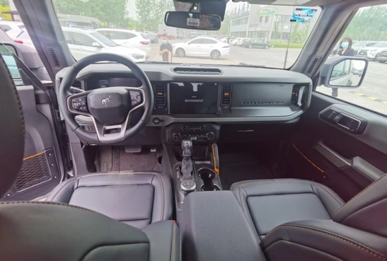 22款福特烈马Bronco车内采用硬朗的设计风格,中控台设计主次分明且有层次感,用料也厚实,多功能方向盘造型运动,中控屏幕采用内嵌式的设计增添了车内的时尚感,按键布局合理,档把设计精致,座椅宽大厚实,空间宽敞,实用性强。