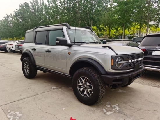 2022款福特烈马Bronco外观方面,新车依旧保持了硬派越野车风格,黑化的中网格栅采用了夸张前卫的设计,两侧圆形的大灯组炯炯有神,点亮后效果足够精致,前保险杠突出的设计样式,使得新车拥有强大