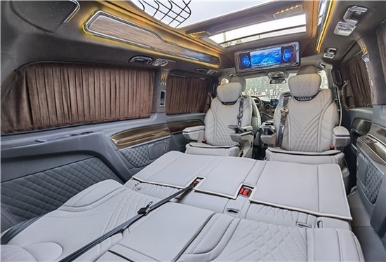 V260L版以下是贵宾舱二个总裁座椅,这二个座椅具有记忆功能,何为记忆功能呢?就是一键展开及一键收回,这个座椅是根据人体工程学设计而成,能一键式找到您身体最舒适的角度。在总裁座椅双侧有两个隐藏式桌板。总裁座椅中间有个热感电子触摸屏幕可控制后舱设备,屏幕下方有个“语音控制系统”也可控制整个贵宾舱的设备。奔驰V260在内部装潢上也进行升级,车体提供真皮、Alcantara以及木材和碳纤维多种材质可供选择。而MPV车型看中的合金踏板、合金门把手以及内装台板等这款车都有所配备。科技配置还有AppleTV、两个独立15.6英寸显示屏、蓝光播放器以及DVB-T信号接收系统等。