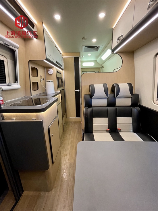双人会客区为连排双人座椅,对于乘坐舒适感来说是有提升的,座椅面略微上扬,当乘客落座的时候身体有一定的后仰,一定程度上能坐的更安稳一些,不容易滑下来。座椅底座距离地板的边缘最大间距为1000mm,充分保证了乘客腿部空间,甚至可以将腿伸直,半躺状态都可以。厨房区位于会客区后方,能在B型房车内拥有功能齐全完备的厨房使用功能实属不易。不仅厨房区拥有不锈钢洗菜池、电磁炉、储物柜,在厨房的一侧还配有美的微波炉和88L冰箱,可谓麻雀虽小,五脏俱全。如果觉得操作台太小,在一侧还贴心配有延伸,增加操作台面积并且在不用的时候还不占空间。