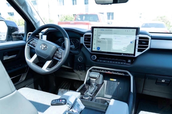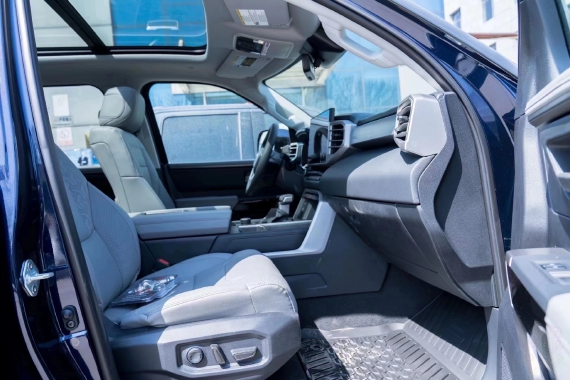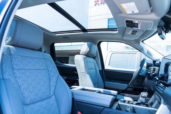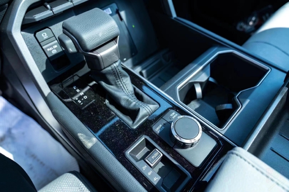 2022款丰田坦途3.5TT座椅提供有皮质包裹,整体的造型也非常宽大,在中央扶手区域的设计上也采用了非常方正的造型设计,并且可以看到前排的储物空间设计还是非常丰富的。