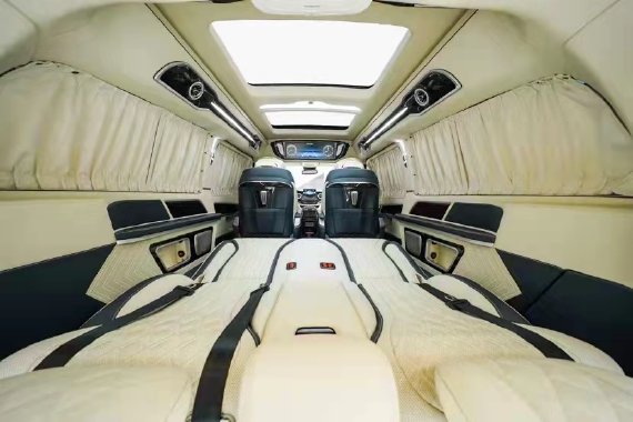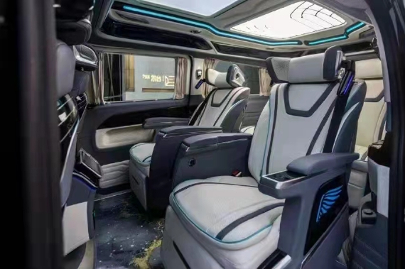 奔驰V250前后排隔断的处理方式,更好的为大家提供隐秘性并且大大提升了后排的娱乐体验。隔断采用的是32寸曲面屏电视后排的乘客可以通过隔断下方的中央操控面板控制的电视升降和车内灯光的调节。