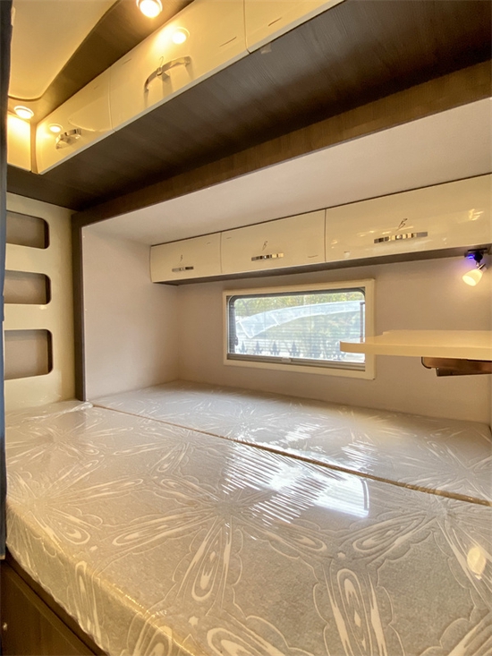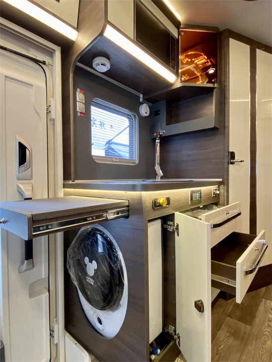 内饰方面,车内家具采用的是环保木质组合家具和韩国LCI原装进口环保防火地板革,不仅绿色环保,还防水、防潮、防变形。家具颜色选择了浅色系,搭配暖色氛围灯营造出一种温馨奢华的氛围。布局方面,从前至后依次为驾驶室、会客区、厨房区、卫生间和休息区。四周都有储物柜,零碎的小物件收纳在里面,也不怕随意放置弄丢了。整车内饰的前部,设计了一个多功能额头床,停车休息的时候把床板放下,一张2200*1470的双人额头床就出现了。掀起额头床,我们在下方内嵌了一个32寸智能电视,在旅途中看看电视放松一下是绝佳的选择。
