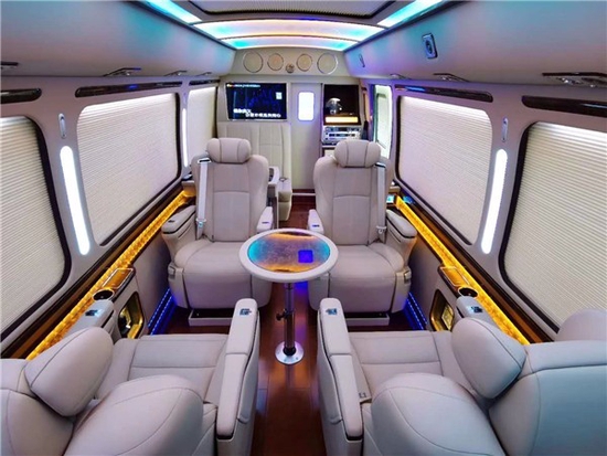 丰田考斯特在改装方面更加注重商务旅行中办公的实用性。车内的真皮航空座椅,电动调节装置可以让您自行调节最舒适的空间距离、靠背以及脚托的角度,特殊的座椅构造,增加腰部的支撑,宽敞的空间让您的双腿收放自如,忘却旅途的紧迫感,体验如家般的感觉,缓解您在行车旅途中的疲劳。华通丰业丰田考斯特改装商务车内饰增加豪华高档办公桌以桃木及真皮为材料,打造最舒适高端使用的办公环境。