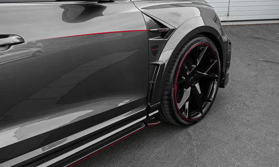 MANSORY迈莎锐是出了名的用碳艺术家,整车侧面部分我们也看见了碳纤维的出现,后视镜、侧裙部分,还有前翼子板上都有它的身影,同时MANSORY的字母表示也低调现身。