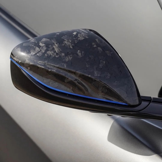 车身锻造花碳细节展示——华美的碳纤维编织纹理凸显出车主卓尔不群的个性品味,浑然天成的无损嵌合技术将MANSORY迈莎锐超迈绝伦的工艺水准映衬得一览无余。