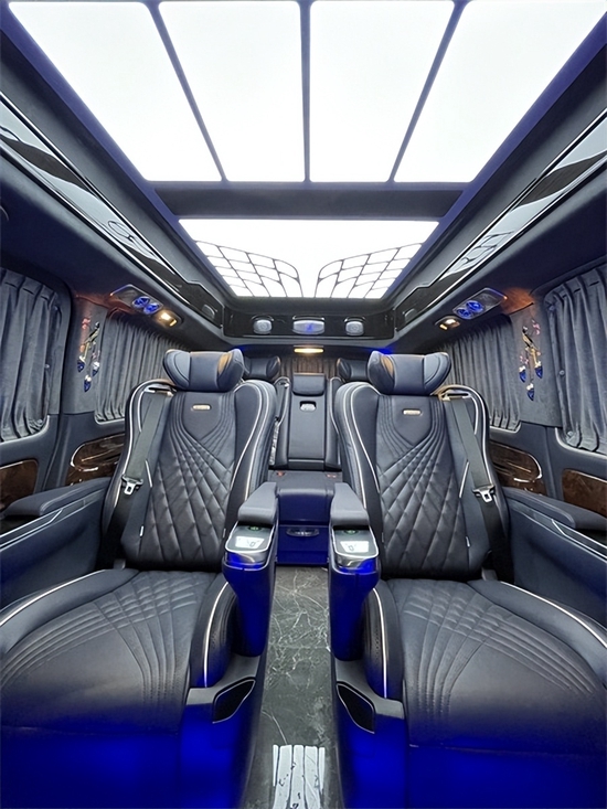 全新奔驰威霆2+2+3座椅陈列,也是商务车最为流行的座椅布局,第二排航空座椅,打孔真皮处置更透气,座椅透风、推拿赐与您更温馨的乘坐感触,更有360度扭转功用;奔驰威霆7座商务车无论是家庭出游照顾孩子、陪家人谈天,亦或是商务洽谈,都能让您随心所欲。在奔驰威霆主副驾驶座椅后方安装有手动小桌板,可承重10公斤,文娱影音配备齐全,24寸高清固定式液晶电视,需求时可随时开启,配合进口丹拿音响,这就是传说中的移动家庭影院,最主要的内饰就是座椅。在改装后奔驰奔驰威霆车顶设计上也富有层次感,灯光采用碎钻搭配,使整车内部空间氛围温馨且大气,而且在造型上也是亮点突出,三款时钟搭配,无时无刻都在彰显奔驰威霆改装商务车高顶版的豪华非凡