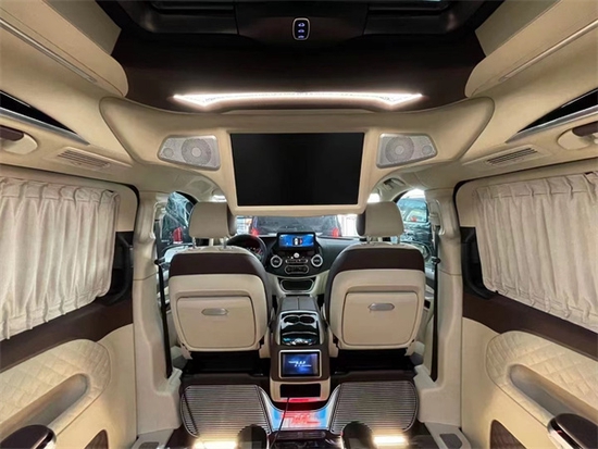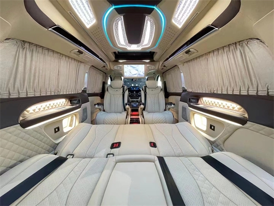 18寸小隔断电视,下方小吧台带触控屏灯光的一键控制,非常便捷,独立的办公桌板更好的为您提供办公用途,米色的超纤真皮与橡木的点缀,无时无刻都在彰显他的豪华非凡,车顶覆盖天使之翼光纤顶灯和意大利进口Alcantara麂皮,整车覆盖超纤皮革。整车配备防震棉和隔音棉。